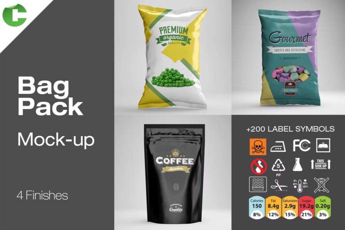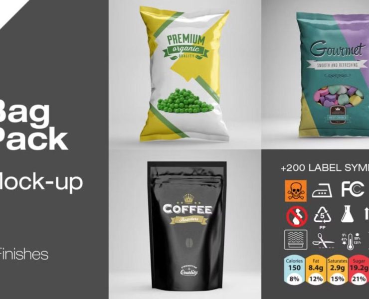 This is a bag pack mockup. You get food, foil, a snack bag with 4 finishes. You can place your artwork easily using smart objects. This mockup is fully layered and named this makes you easy and simple.
