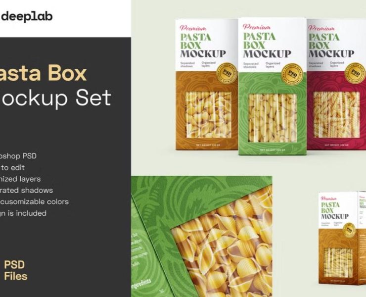 You can customize the label and box cut out through smart objects. The two different types of pasta are included in the mockup.