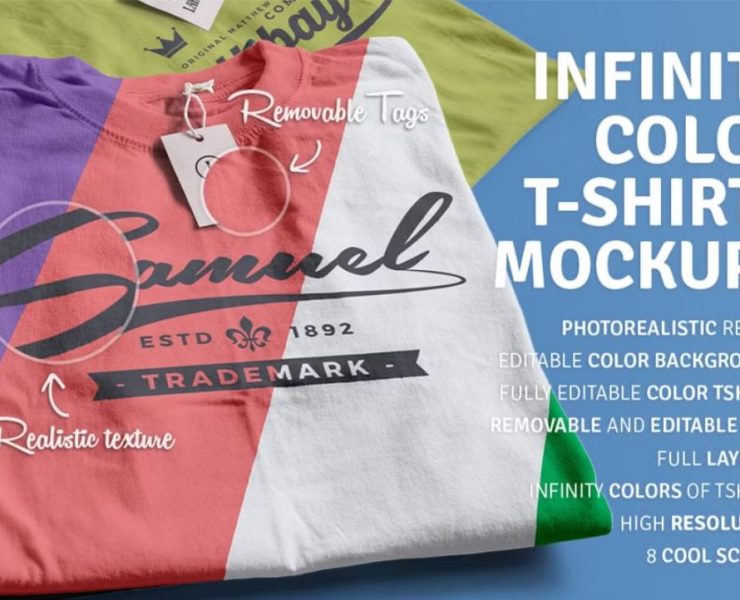 In this pack, you get 18 PSD files for presenting the design from different angles. The background of the presentation can be edited easily via smart objects. The tags of the T-shirts can be edited or removed according to your needs.